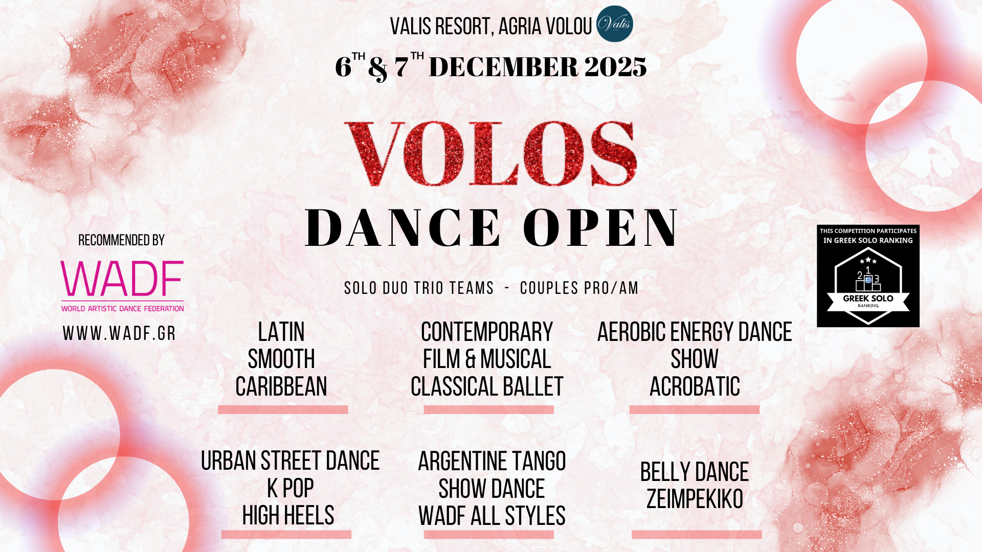 VOLOS DANCE OPEN 2025 Registration Timetable Click here Startlist Click here Results Click here Competition Details Regulations Accommodation Location - Competition Hall Judge Panel Music Make up & Hairstyle Sponsors